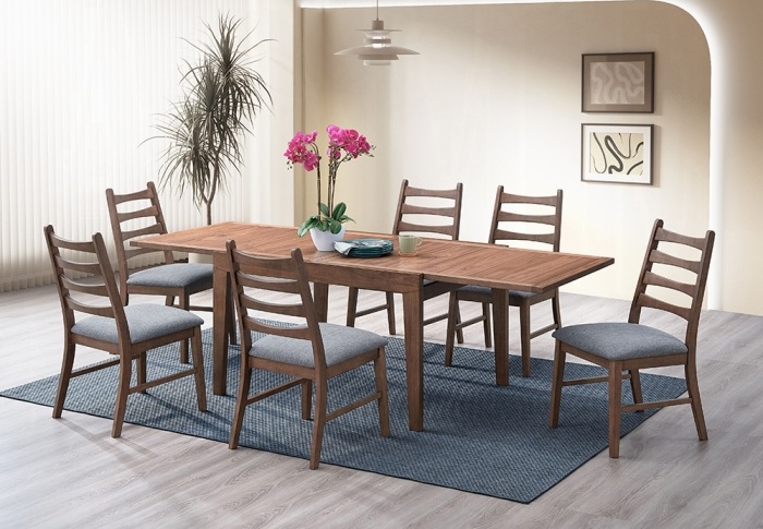 Acme DN04170-7PC 7 pc Mayah walnut finish wood mid century modern dining table set grey chairs. This set includes the table, 6 – side chairs. Table measures 35″ W x 47″ (94″ with 1 – 47″ leaf) x 30″ H. Chairs measure 20″ x 22″ x 38″ H to the back. Chairs come in Grey and Dark grey. Additional chairs also available separately at additional costs. Some assembly required.