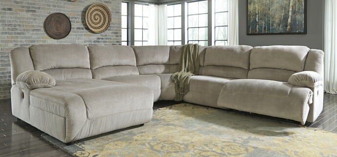 5 pc Toletta II collection granite colored fabric sectional sofa with recliners and chaise. This set includes the RAF power recliner, armless chair, corner wedge, armless recliner, and LAF power chaise. Measures 128″ x 126″ x 39″ D x 41″ H. Some assembly required.