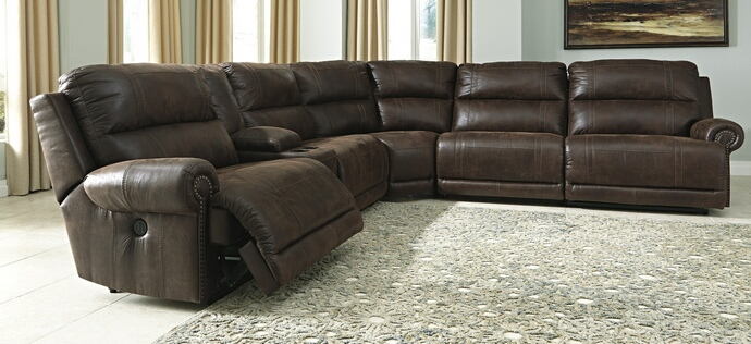 6 pc Luttrell collection espresso colored fabric sectional sofa with three recliners. This set includes the LAF recliner, console, armless recliner, corner wedge, armless chair and RAF recliner. Measures 140″ x 127″ x 40″ D x 43″ H. Some assembly required.