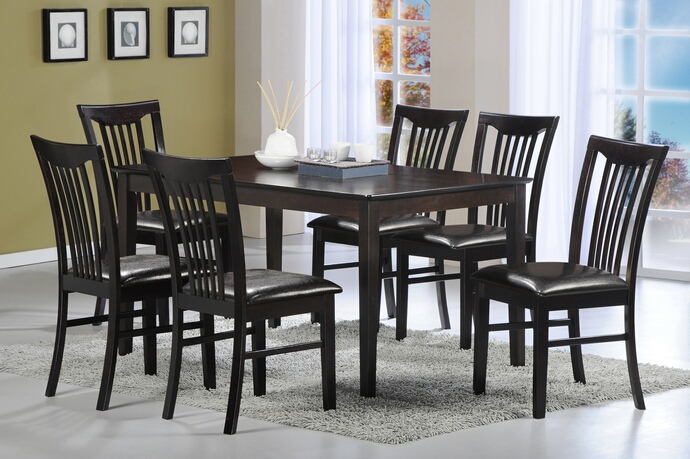 7 pc avalon espresso finish wood dining table set. This set includes the table with tapered legs and 6 side chairs upholstered with vinyl seats and slat backs. Table measures 36″ x 60″ X 30″ H. Chairs measure 38″ H to the back. Some assembly required.