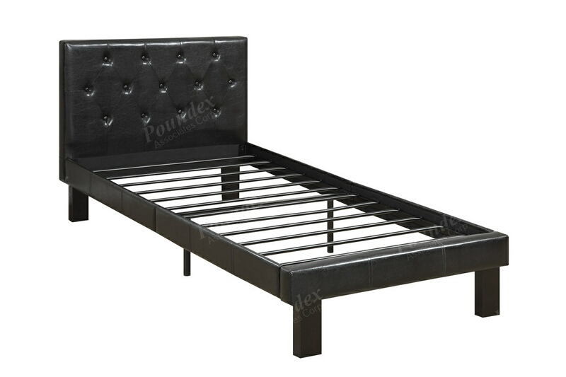 Bernadette collection black faux leather headboard twin bed. Measures 35″ H headboard / 13″ H footboard and metal slats (no box spring required). Some assembly required.