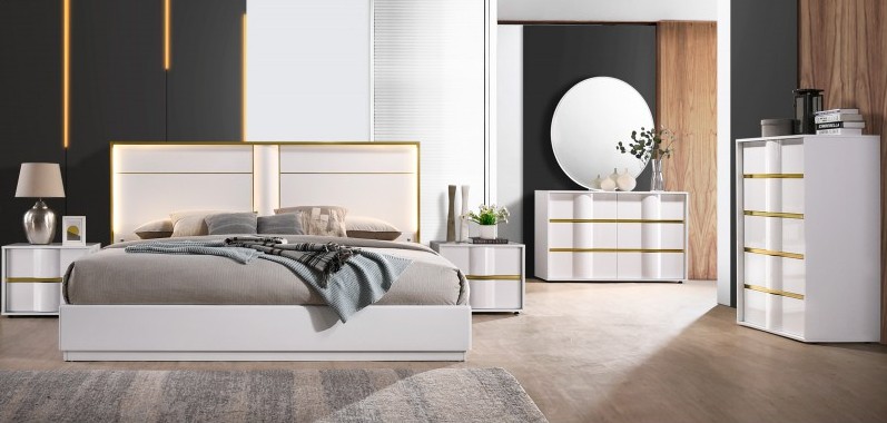 Best Master Havana 4 pc Orren ellis kumail Havana white high gloss finish wood with gold trim modern style queen bed set. Queen bed set includes the Queen bed frame, one nightstand, Dresser and mirror. Queen bed measures 84″ x 68″ x 48″ H. Nightstand measures 22.5″ x 17″ x 19″ H, Dresser measures 48″ x 17″ x 32″ H. Mirror measures 42″ x 1″ x 36″ H. Some assembly required for the bed frame set and mirror. Optional chest available separately. Also available in Cal king and Eastern king size at additional cost.