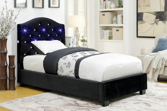 Betelgeuse II collection black padded flannelette fabric and LED button light up tufted twin bed set. Also available in full , Queen, Cal king, and Eastern king size at additional cost. Twin bed measures 84 1/2″ x 44 3/4″ x 50 1/2″ H. Some assembly required.