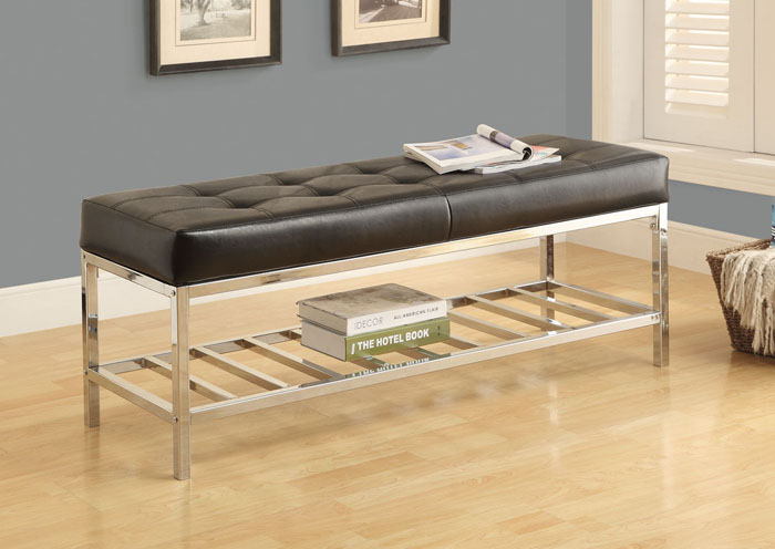 Black Leather-Look / Chrome Metal 48″L Bench. Add A Contemporary Flair To Your Home With This Sturdy Yet Comfortable Bench Featuring A Polished-Chrome Based And A Black Tufted Button Leather-Look Fixed Seat Cushion. Excellent For Hallways, Family Rooms, Mud Rooms Or At The Foot Of You Bed.. 48″L Bench. Sturdy Yet Comfortable. Polished-Chrome Base. Contemporary Design. Padded Seat Cushion. . Some Assembly Required. Measures 48″ x 16″ x 18″.