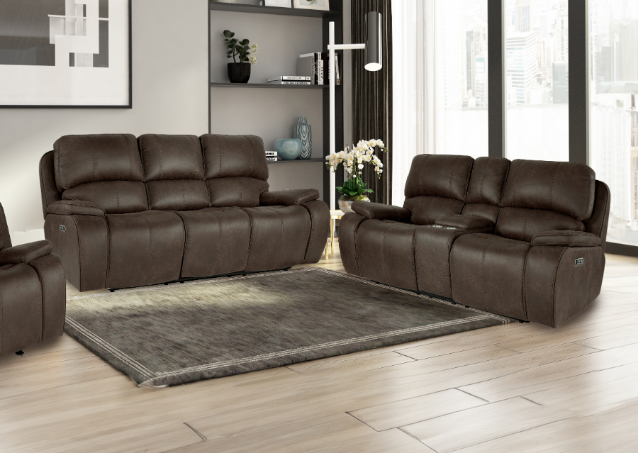 Brookings-BR-PW-SL 2 pc Brookings brown leather like fabric sofa and love seat with power motion recliner ends storage cup console with USB on love seat