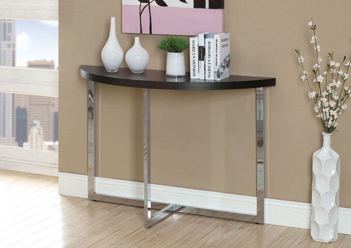 Cappuccino / Chrome Metal Sofa Console Table. Bring A Modern And Sleek Design To Your Home With This Fabulous Chrome Based And Thick Cappuccino Veneer Top. The Curved Half- Moon Shaped Console Table Top Adds A Degree Of Sophistication And Fits In Any Spot In Your Room.. Modern And Sleek Design. Chrome Based And Thick Cappuccino Veneer Top. Curved Half- Moon Shaped Console Table Top. . Some Assembly Required. Measures 47″ x 16″ x 32″.