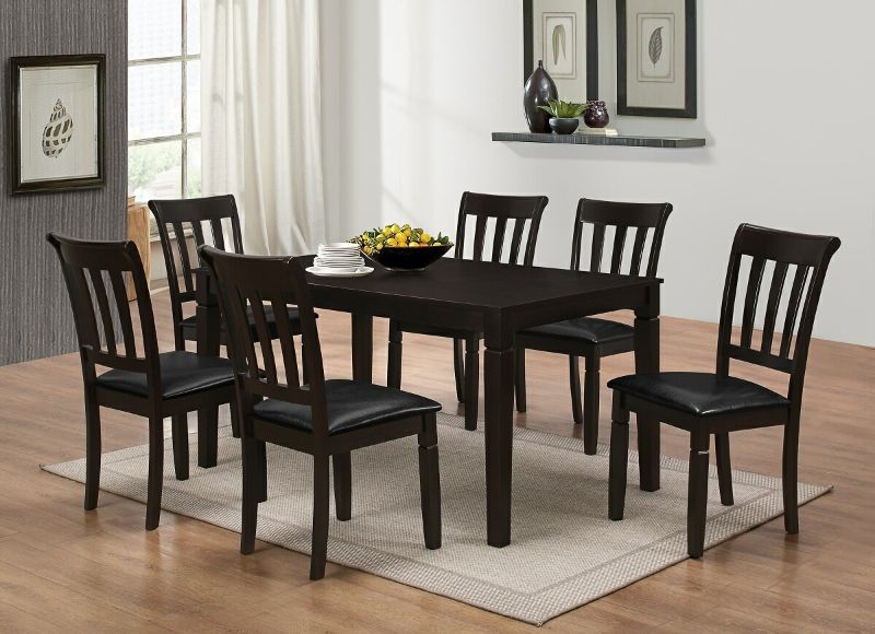 7 pc Winston porter winnetka espresso finish wood dining table set. This set features a dining table and 6 – side chairs with faux leather padded seats. Table measures 60″ x 36″ x 30″ H. Chairs measure 19.5″ x 20″ x 37.75″ H. Some Assembly Required.