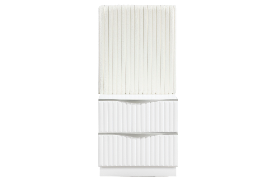Homelegance 2384-7PC 7 pc Linea pearl white finish wood cream faux fur headboard and panels queen bedroom set. This set includes the Bed, 2 – Nightstands, 2 – side panels, Dresser, Mirror. Bed features a corduroy faux fur upholstered headboard and side panels, ribbed design embossed panels on Nightstand and Dresser. Bed measures with side panels 114.5″ x 86.5″ x 53″ H. Nightstand measures 27.75″ x 21.75″ x 28.75″ H. Dresser measures 60″ x 18.5″ x 36.5″ H. Mirror measures 38″ x 1″ x 38″ H. Chest available separately at additional cost and measures 35.5″ x 19″ x 50.5″ H. Also available in Cal King and Eastern King. Some assembly required.