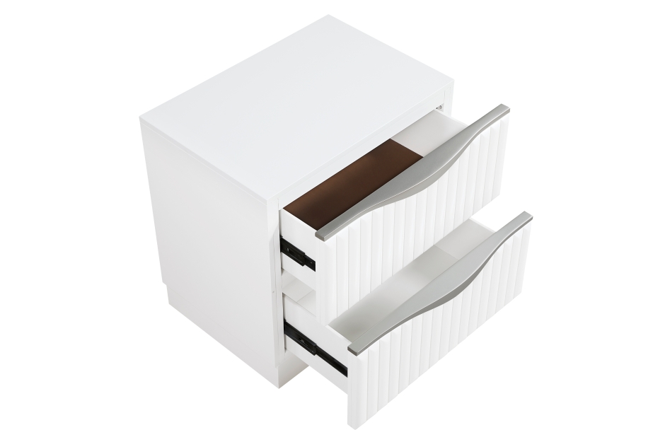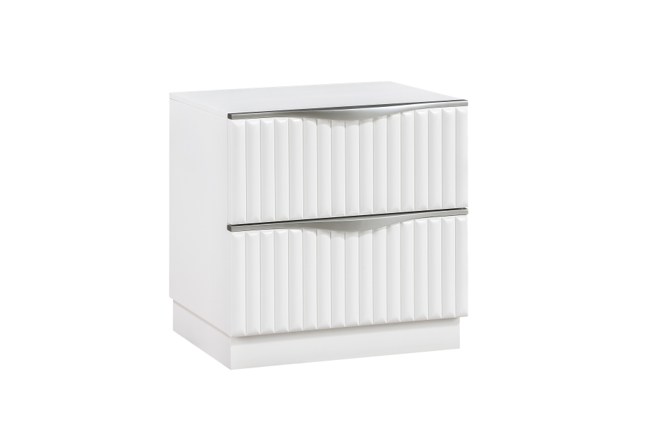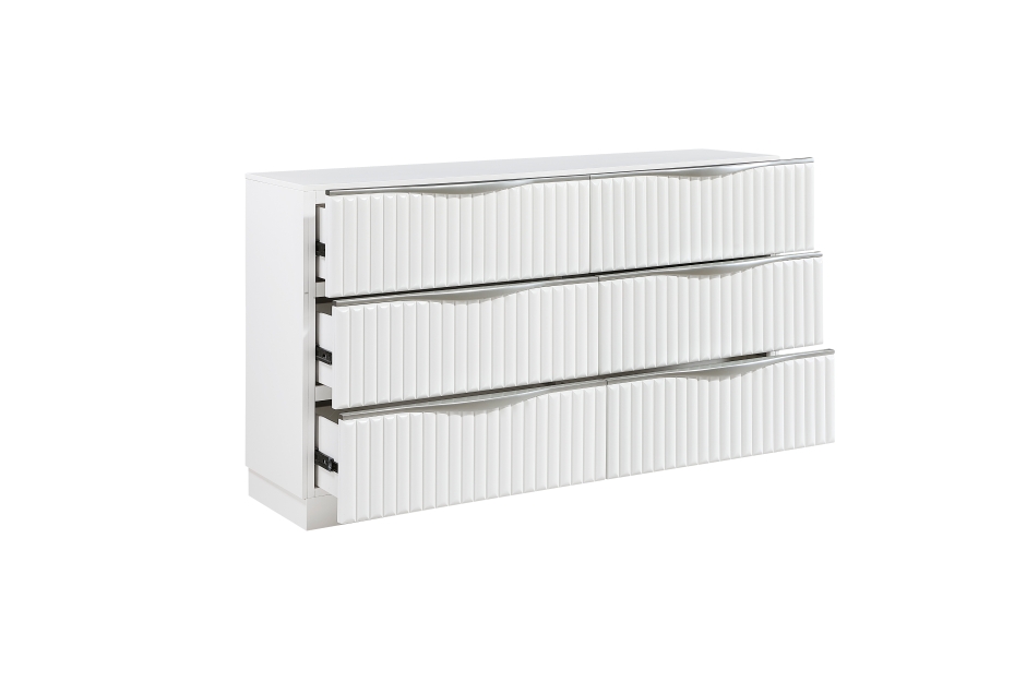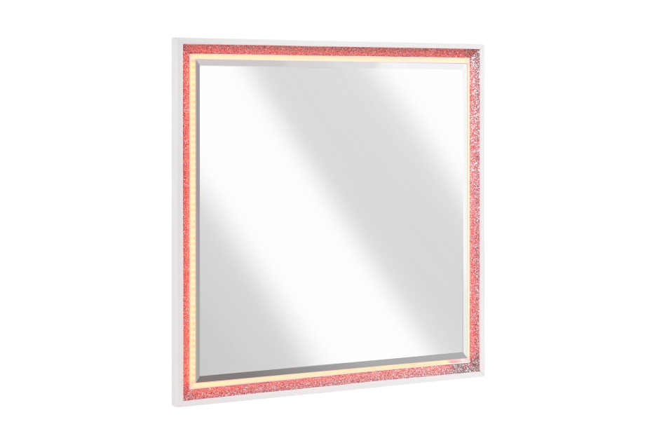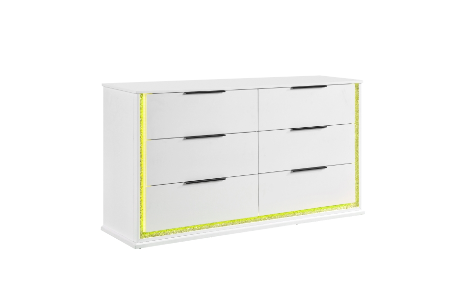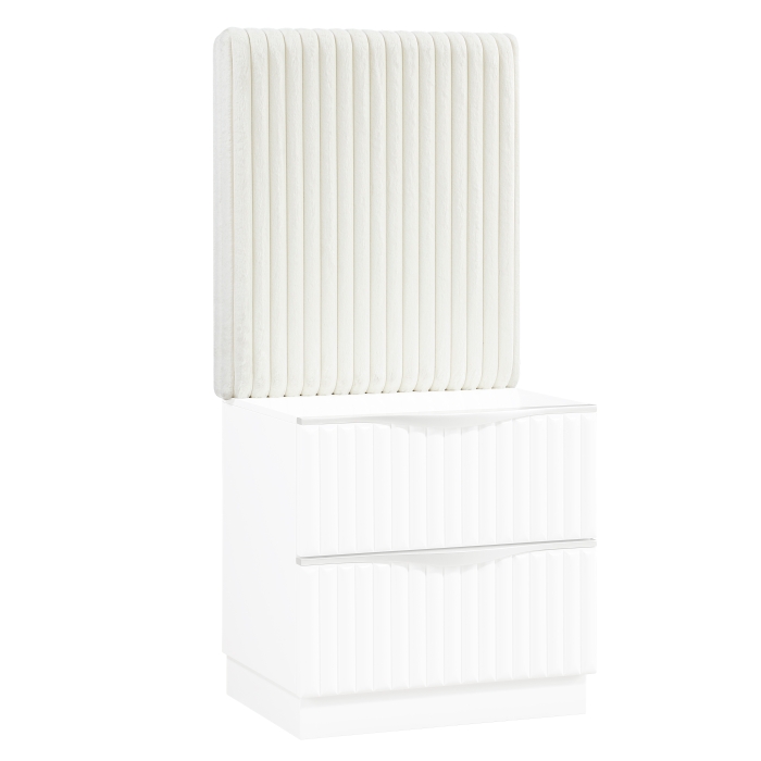 FM7700WH-4PC 4 pc Isadora antique white finish wood channel tufted fabric led lighting trim queen bed set. This set includes the Bed, Nightstand, Dresser, Mirror. Bed measures 86″ x 63.5″ x 60″ H. Nightstand measures 26″ x 17″ x 26.5″ H. Dresser measures 64″ x 18″ x 37″ H. Mirror measures 37.5″ x 37.5″ x 1″ D. Chest available separately at additional cost and measures 37″ x 17″ x 52.5″ H. Some assembly required. Also available in Cal king and Eastern king at additional cost.