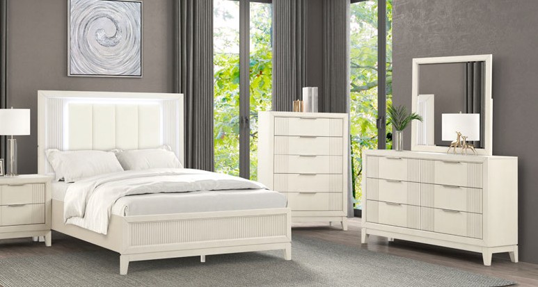 FM7700WH-4PC 4 pc Isadora antique white finish wood channel tufted fabric led lighting trim queen bed set. This set includes the Bed, Nightstand, Dresser, Mirror. Bed measures 86″ x 63.5″ x 60″ H. Nightstand measures 26″ x 17″ x 26.5″ H. Dresser measures 64″ x 18″ x 37″ H. Mirror measures 37.5″ x 37.5″ x 1″ D. Chest available separately at additional cost and measures 37″ x 17″ x 52.5″ H. Some assembly required. Also available in Cal king and Eastern king at additional cost.