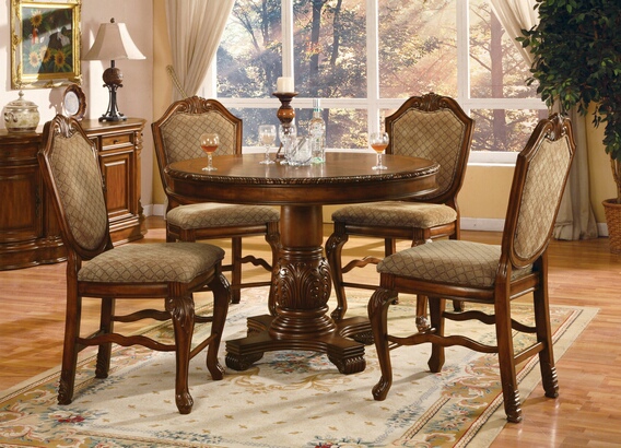 5 pc Chateau De Ville collection cherry finish wood round counter height pedestal dining table set with diamond pattern fabric padded chairs. This set features a round counter height table with decoratively carved accents, 4 – side chairs with a diamond pattern fabric padded back. Table measures 48″ Dia. x 36″ H . Chairs measure 24″ H seat height. Some assembly required.