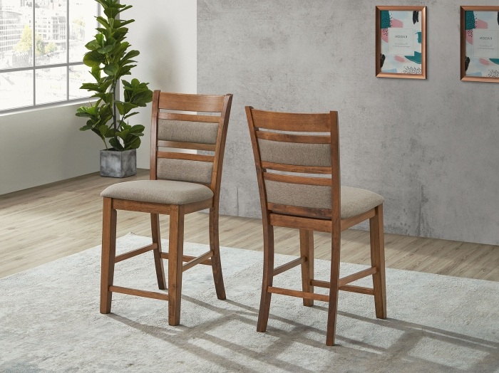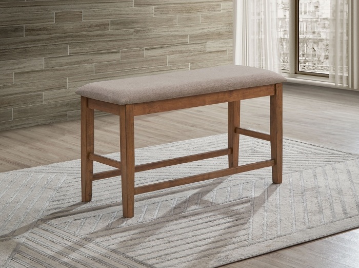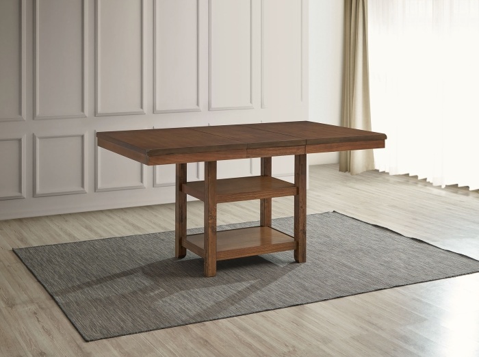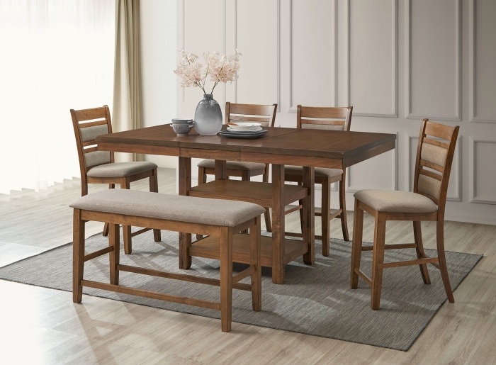 7802-6PC 6 pc Graven antique brown finish wood storage pedestal base counter height dining table with with bench. This set includes dining table and 4 – side chairs and bench with padded seats. Table measures 42″ x 54″ (72″ with 1 – 18″ butterfly leaf) x 36″ H. Chairs measure 19.25″ x 21″ x 41.35″ H. Bench measures 45.5″ x 16″ x 25″ H. Some Assembly Required.