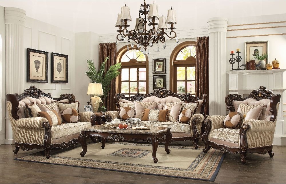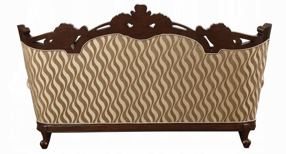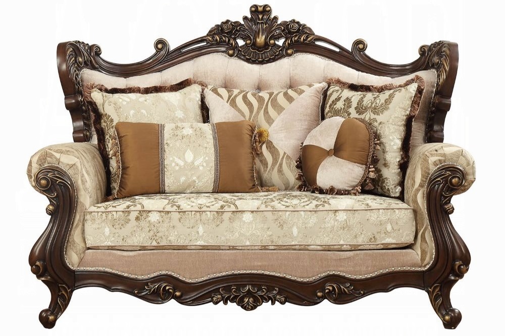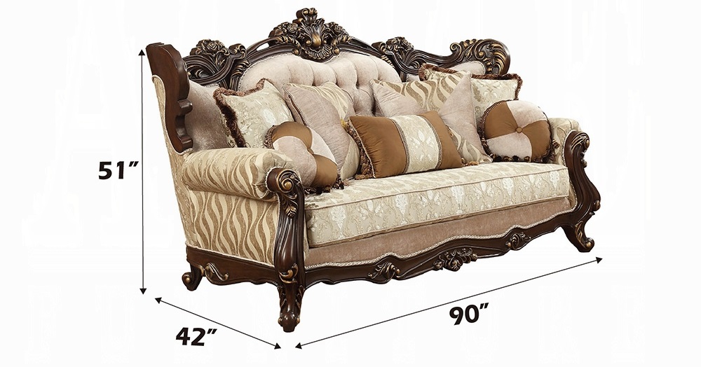 Acme 51050-51 2 pc Astoria grand camren shalisa walnut finish wood fabric sofa and love seat set. This set includes the Sofa and love seat with padded backs and throw pillows, with carved accents. Sofa measures 90″ x 42″ x 45″ H. Love seat measures 70″ x 42″ x 45″ H. Optional chair available separately and measures 45″ x 36″ x 51″ H. Some assembly may be required.