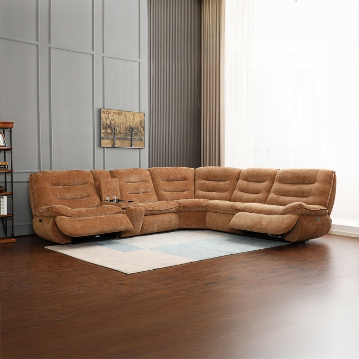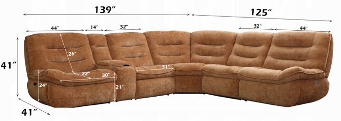 Acme LV04650 6 PC Emmy orange chenille fabric power motion sectional sofa with large seats cup console USB . Features zero gravity power reclining seating on the two end recliners, cup console with storage and wireless charging dock , mid century modern design. Sectional measures 139″ x 125″ D x 41″ H. Some assembly may be required.