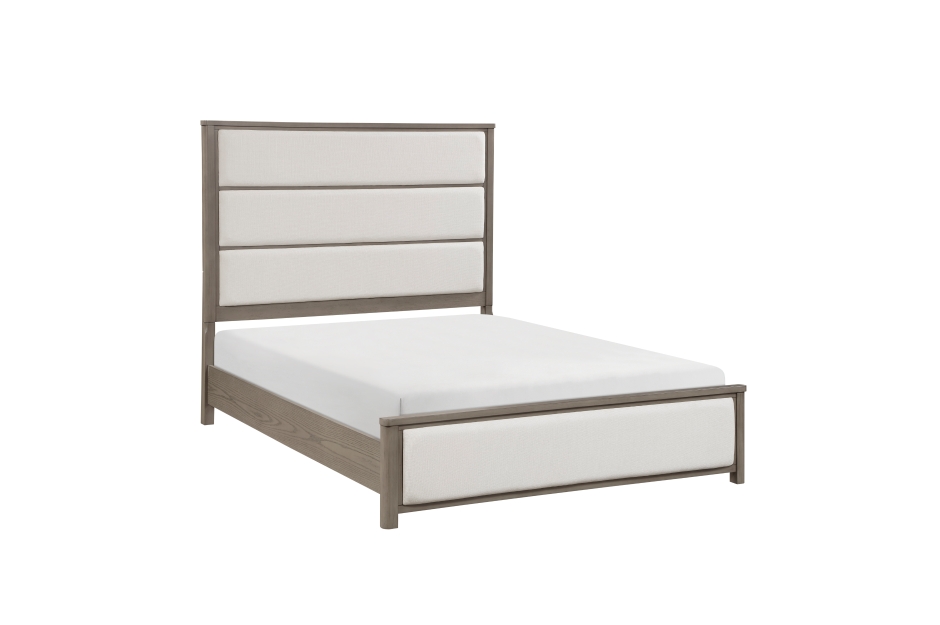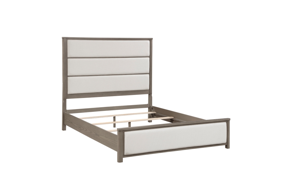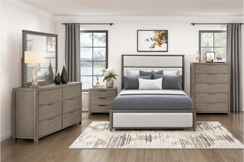 Homelegance 2393-4PC 4 pc Dalston light grey finish wood beige fabric upholstered headboard queen bedroom set. This set includes the Bed, Nightstand, Dresser, Mirror. Bed measures 64.5″ x 87″ x 60″ H. Nightstand measures 26″ x 17″ x 26″ H. Dresser measures 60″ x 18″ x 35.5″ H. Mirror measures 41″ x 2″ x 40″ H. Chest available separately at additional cost and measures 37″ x 18″ x 52″ H. Also available in Eastern King. Some assembly required.
