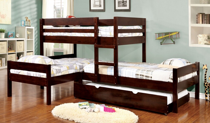 4 Twin bed Ranford collection Twin over Twin over Twin espresso finish wood bunk bed with twin trundle pull out. This set features 3 twin beds in an “L” shaped setting with a twin slide out trundle . Measures 124 5/8″ x 80 1/4″ x 56″ H. Some assembly required.