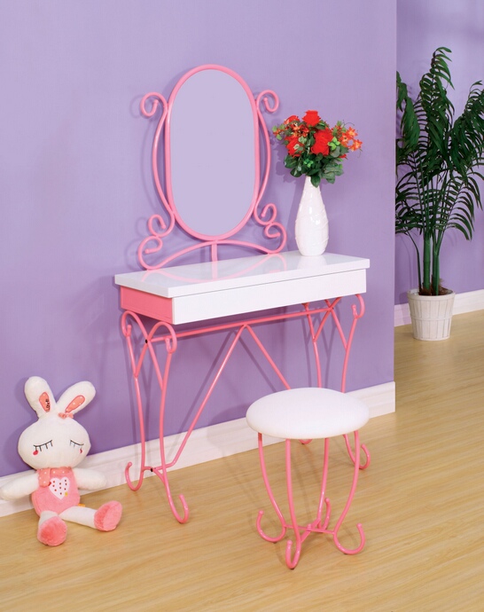 3 pc Enchant II collection Pink metal frame and white finish wood bedroom make up vanity set. This collection comes with the vanity , mirror and stool. Vanity measures 31 1/2″ x 15 3/4″ x 29 3/4″ H. Mirror measures 26 1/2″ x 28 3/4″ x 1″ D. Stool measures 13″ Dia. 18 ” H. Some assembly required.