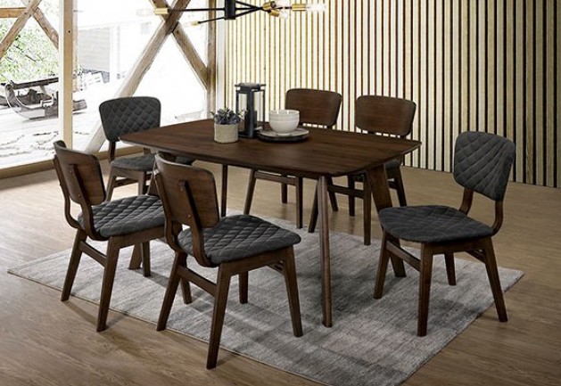 7 pc George oliver delatorre shayna mid century modern style gray walnut finish wood dining table set. This set includes the table and 6 side chairs . Table measures 59 1/8″ x 35 1/2″ x 29 3/4″ H. Side chairs measure 18 3/8″ x 22 5/8″ x 33 1/2″ H. Chairs come without padded backs. Some assembly required.
