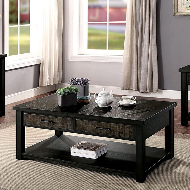 CM4123C Canora grey gillespie rhymney rustic dark oak finish wood coffee table with drawers. Measures 48″ x 26″ x 18″ H. Some assembly required.