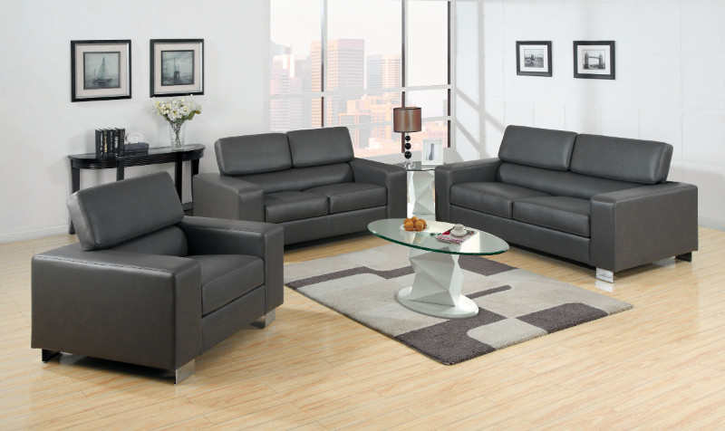 2 pc makri gray bonded leather sofa and love seat with foldable headrests and chrome legs. The Makri modern style squared arm sofa set features foldable headrests and chrome legs . Sofa measures 84 1/4″ x 40 1/8″ x 29 1/2″ H. Love seat measures 68 1/8″ x 40 1/8″ x 29 1/2″ H. Chair also available separately and measures 45 1/4″ x 40 1/8″ x 29 1/2′ H. Some Assembly May Be Required.
