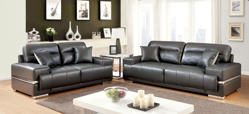 2 pc zibak gray breathable leatherette modern style sofa and love seat. This set features silver trim, chrome legs and modern styling. Sofa measures 88 1/2″ x 37″ x 37″ H. Love seat measures 73″ x 37″ x 37″ H. Chair also available separately and measures 48 1/2″ x 37″ x 37″ H. Some Assembly May Be Required.