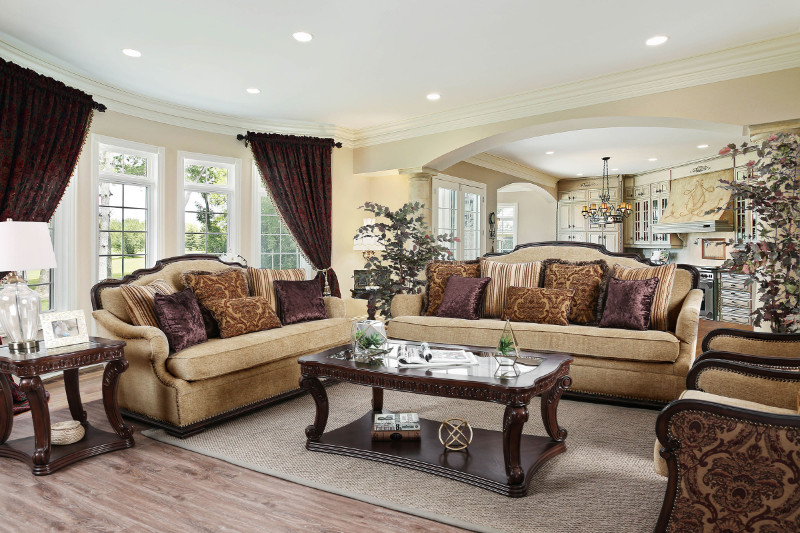CM6584 2 pc Matilde brown chenille dark oak trim sofa and love seat set