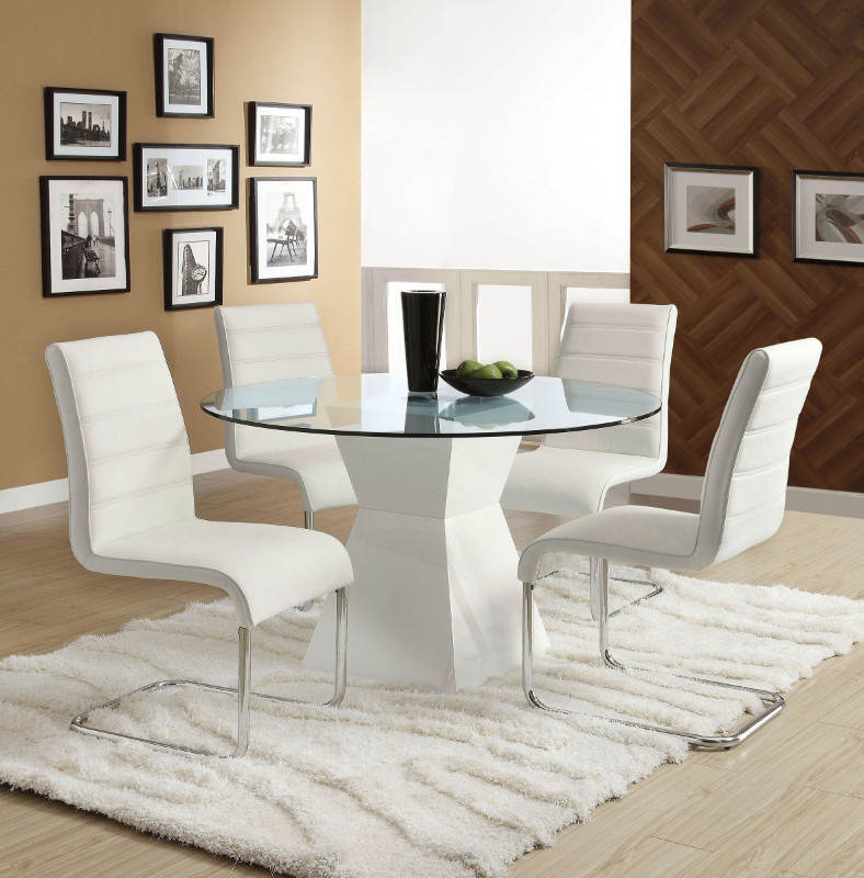 5 pc mauna modern 45″ round glass table top white base dining table set. This set includes the table and 4 – side chairs. Table measures 45″ Dia. x 30″ H. Side chairs measure 22.25″ x 17″ x 38″ H. Some assembly may be required.