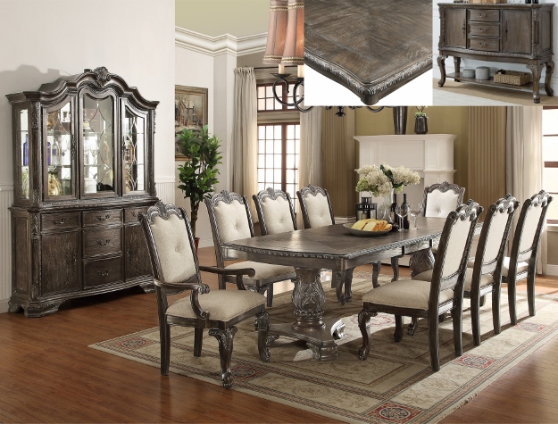 Source: Crown mark 2151T 7 pc Wila arlo interiors Kiera grey finish wood formal dining table set with carved accents