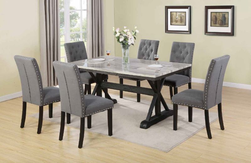 D116-7PC 7 pc Darby home co lona espresso finish wood faux marble top dining table set. This set includes the Table, 6 – chairs. Table measures 38″ x 64″ x 30″ H. Side chairs measure 18″ x 24″ x 39″ H. Some assembly required.