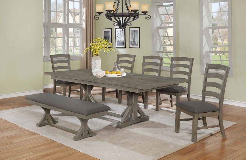 D21-7PC 7 pc One allium way trixie antique gray finish wood double pedestal dining table set. This set includes the Table, 5 – chairs and Bench. Table measures 42″ x 78″ (96″ with 1 – 18″ leaf) x 30″ H. Side chairs measure 21″ x 22″ x 41″ H. Bench measures 60″ x 21″ x 20″ H. Some assembly required.