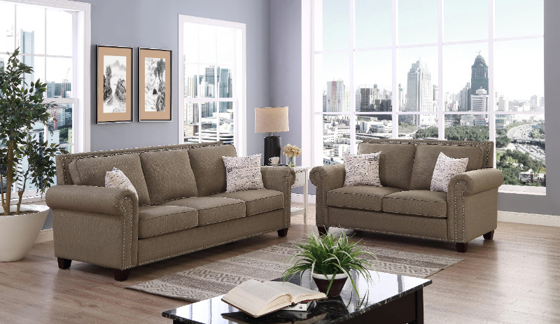 Source: D6831 2 pc Masterpiece tan linen like fabric sofa and love seat set nail head trim