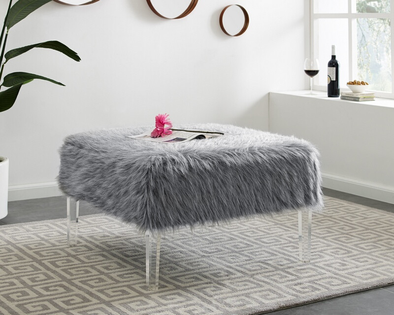 Source: D7942 Belize smokey gray faux fur fabric square ottoman stool bench acrylic legs