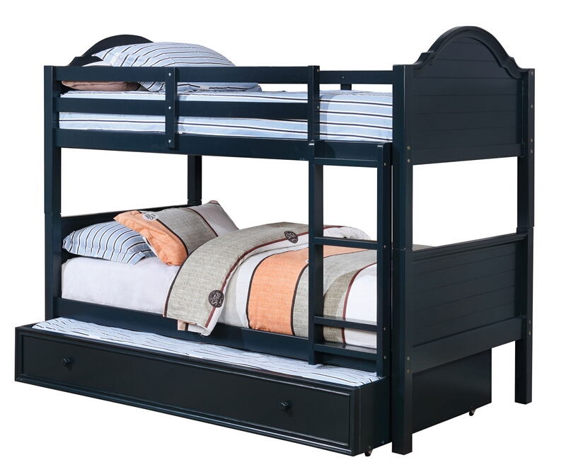 Denise collection blue finish wood twin over twin paneled headboards bunk bed set. Features a paneled look head and foot board. Bunk bed measures 80 1/2″ x 44″ x 66 3/4″ H. Some assembly required. Trundle also available separately at additional cost.