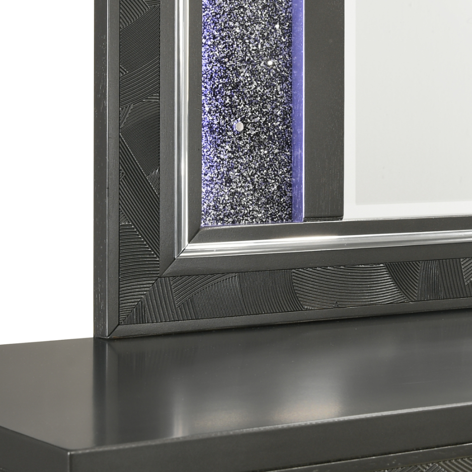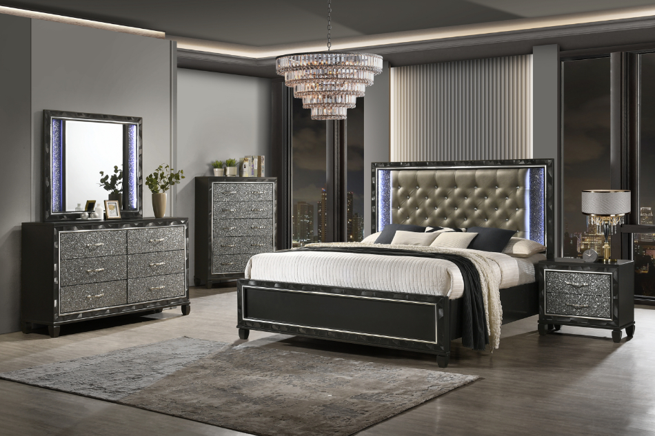 ***Early Black Friday Sale Going On Now***00-976K-4PC 4 pc Radiance black pearl finish wood tufted queen bed set LED lighting and shimmering accents on sale at ambfurniture.com