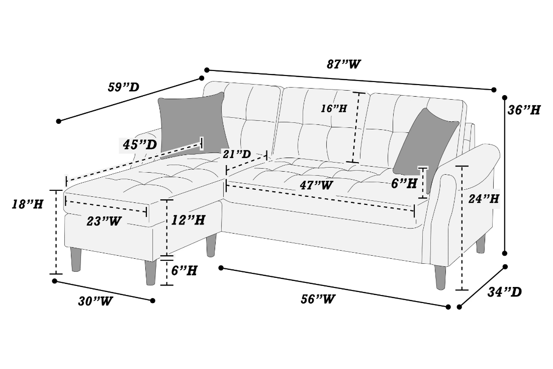 Poundex F6458 2 pc leta light coffee polyfiber fabric apartment size sectional sofa reversible chaise. This set is great for a small apartment or room in your home for additional seating. This set includes the 2 pc sectional sofa reversible ottoman chaise. Sectional measures 87″ W x 59″ L chaise x 36″ H. This set is KD , Ready to assemble. Requires assembly.