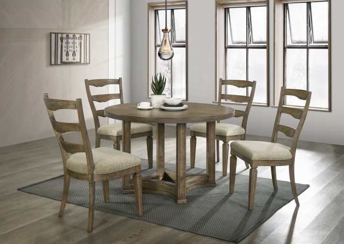 Acme DN01809-5PC 5 pc Parfield weathered oak finish wood 47″ round dining table set grey fabric chairs. This set includes the table and 4 side chairs . Table measures 47″ Dia. x 30″ H. Side chairs measure 19″ x 19.5″ x 39″ H to the back. Some assembly required.