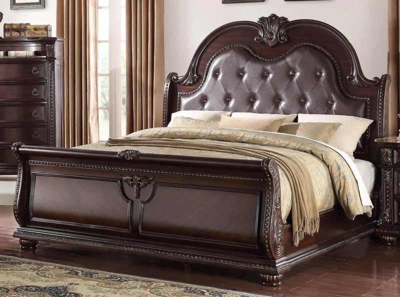 ***Early Black Friday Sale Going On Now***B1600 4 pc Stanley rich brown finish wood faux leather tufted upholstered headboard sleigh style bedroom set with marble tops on sale at ambfurniture.com