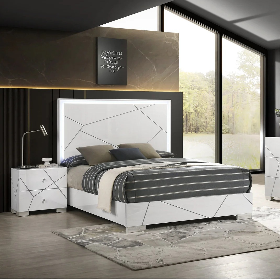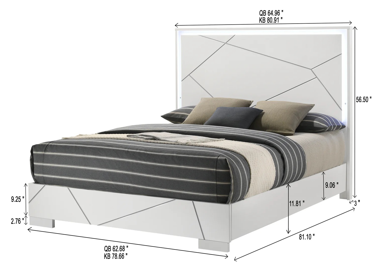 Source: B4520 4 pc Ayla gloss white wood finish geometric design headboard LED lighted queen bedroom set