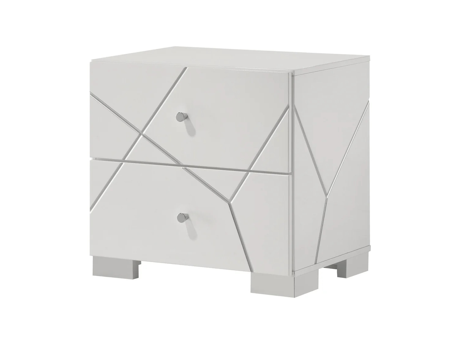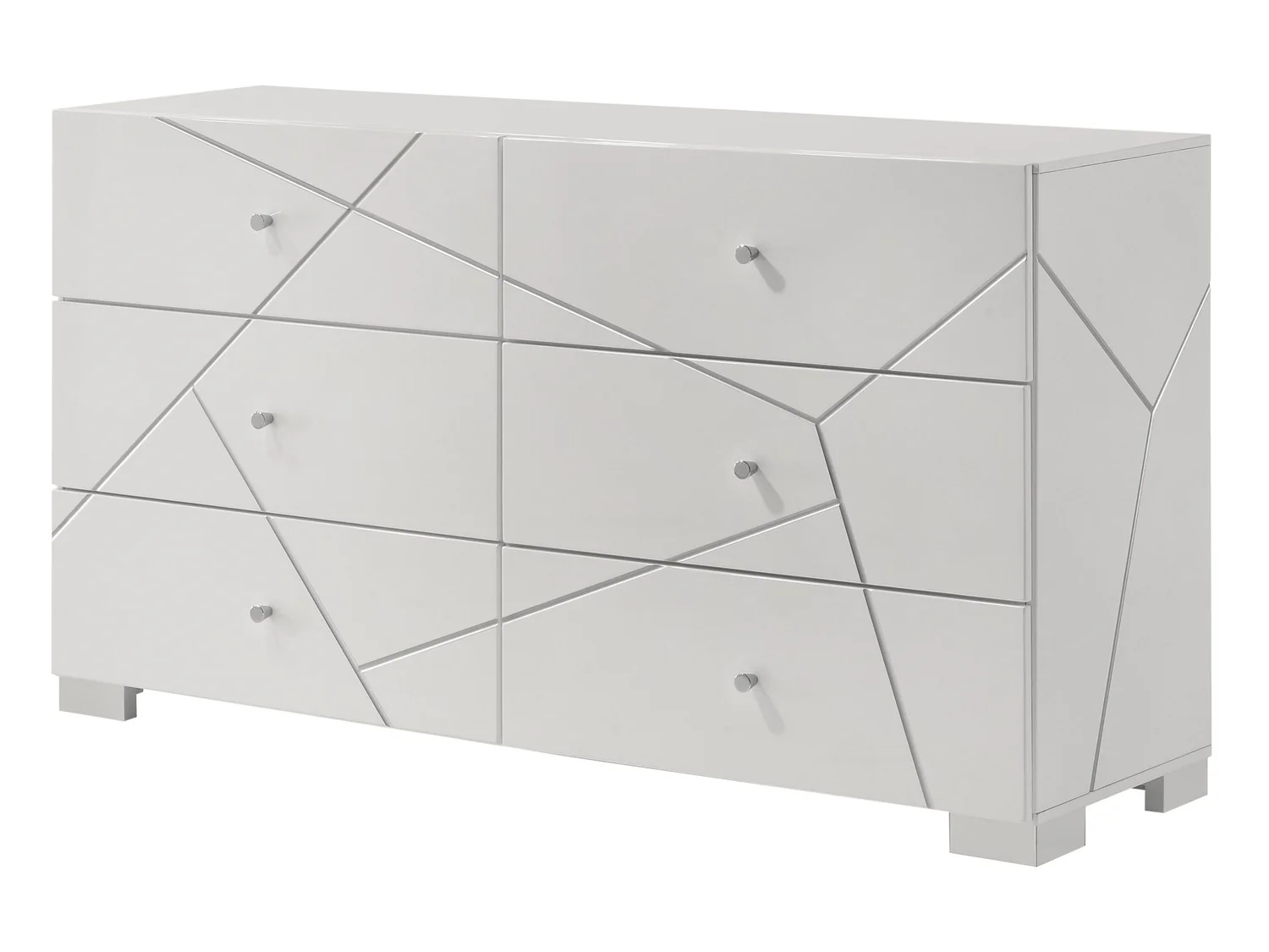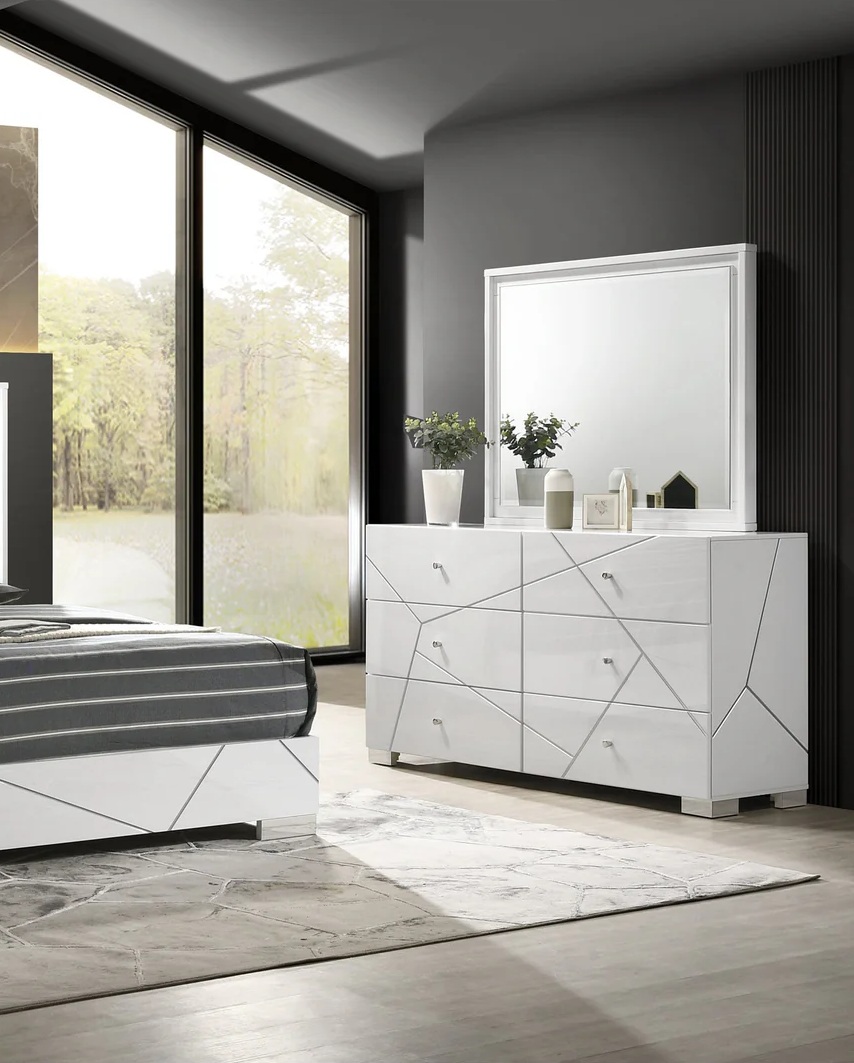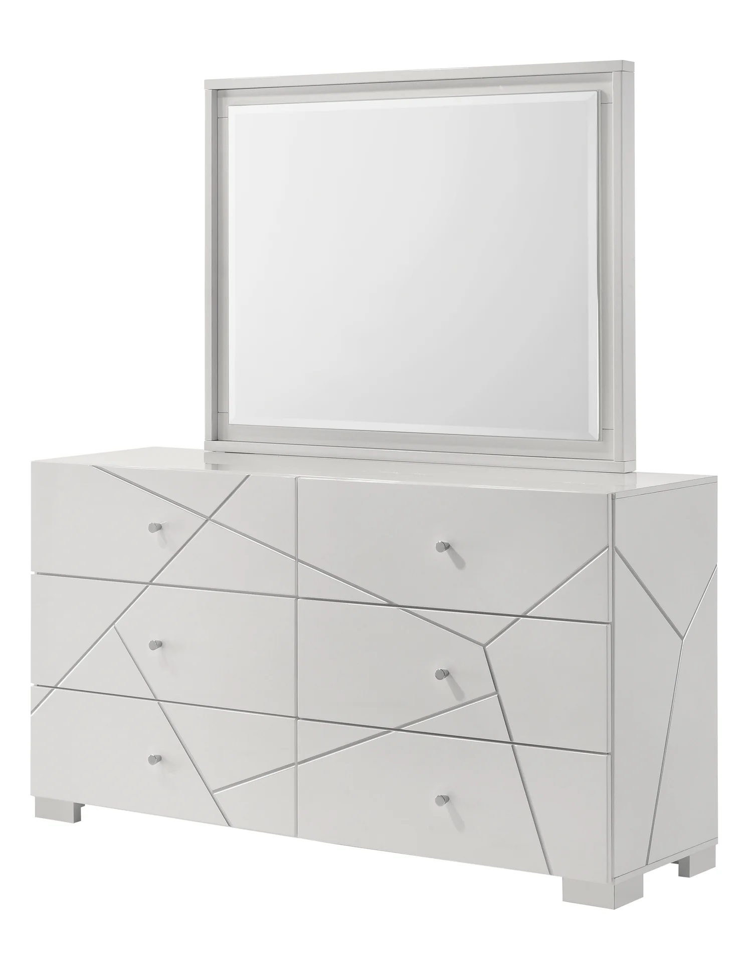 B4520 4 pc Ayla gloss white wood finish geometric design headboard LED lighted queen bedroom set. This set includes the Bed, nightstand, dresser and mirror. Bed measure 65″ x 84.5″ x 56″ H. Nightstand measures 23″ x 16.5″ x 22″ H. Dresser measures 62″ x 18″ x 34″ H. Mirror measures 46″ x 2″ x 36.5″ H. Chest also available separately at additional cost and measures 31″ x 18″ x 45″ H. Also available in Eastern King at additional cost. Some assembly required