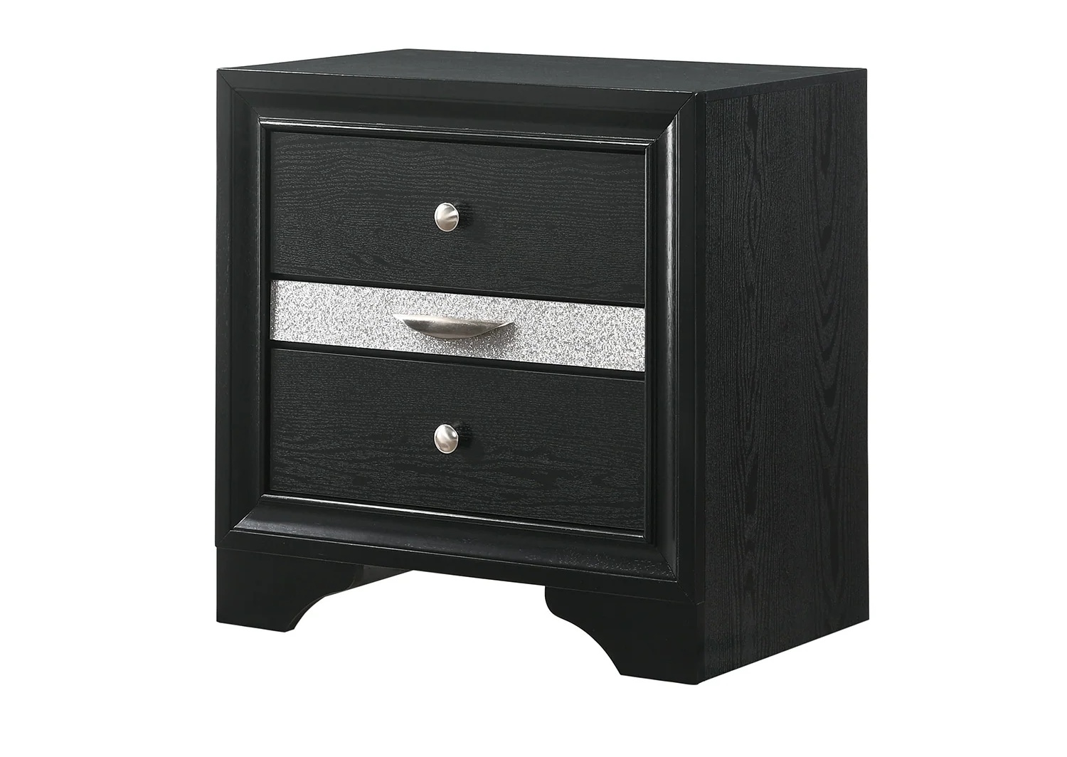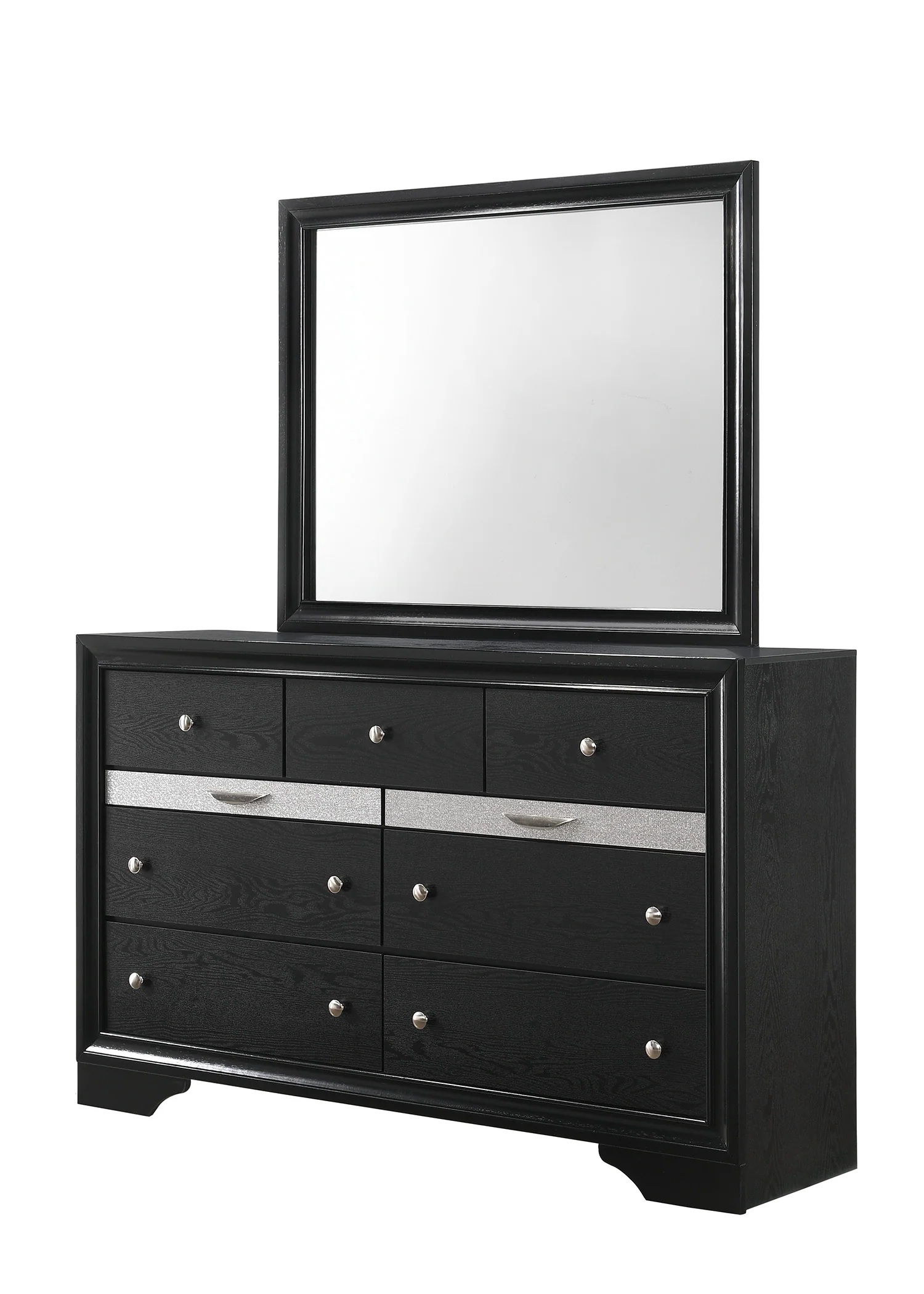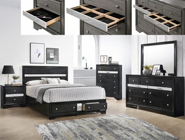 4 pc Regata black and silver finish wood queen storage bedroom set. This set includes the Bed, Nightstand, Dresser, and Mirror. Bed measures 90″ x 64″ x 50″ H. Nightstand measures 26″ x 16.5″ x 26″ H. Dresser measures 63″ x 16.5″ x 39″ H. Mirror measures 47″ x 1″ x 36.5″ H. Optional chest available at additional cost and measures 34″ x 16.5″ x 51.5″ H. Also available in Eastern king. Some assembly required.