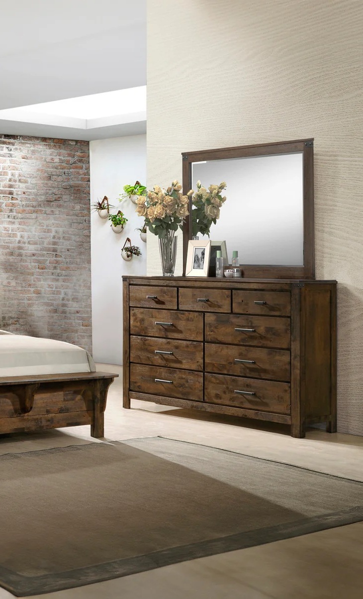 4 pc Curtis rustic weathered finish wood queen bedroom set. This set includes the Bed, Nightstand, Dresser, and Mirror. Bed measures 90″ x 64″ x 58″ H. Nightstand measures 27″ x 16″ x 25.7″ H. Dresser measures 63″ x 18″ x 41″ H. Mirror measures 46″ x 1″ x 34″ H. Optional chest available at additional cost and measures 37″ x 18″ x 50″ H. Also available in Eastern king. Some assembly required.