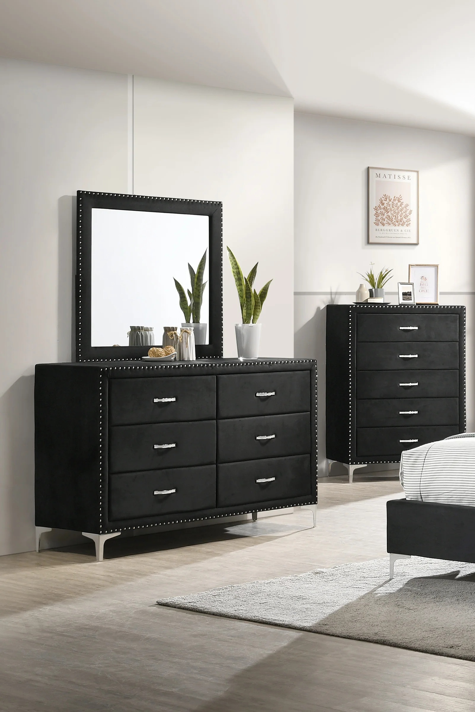 B9265 4 pc lucinda black velvet tufted upholstered queen bedroom set nail head trim . This set includes the Bed, Nightstand, Dresser, and Mirror. Bed measures 84″ x 86″ x 42.7″ H. Nightstand measures 24″ x 19.5″ x 27.5″ H. Dresser measures 60″ x 20.5″ x 37.5″ H. Mirror measures 35″ x 1″ x 40″ H. Optional chest available at additional cost and measures 35.5″ x 20″ x 50″ H. Also available in Eastern king. Some assembly required.