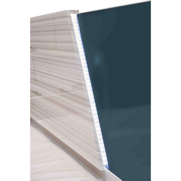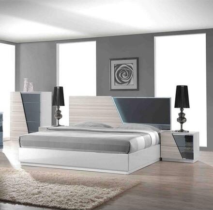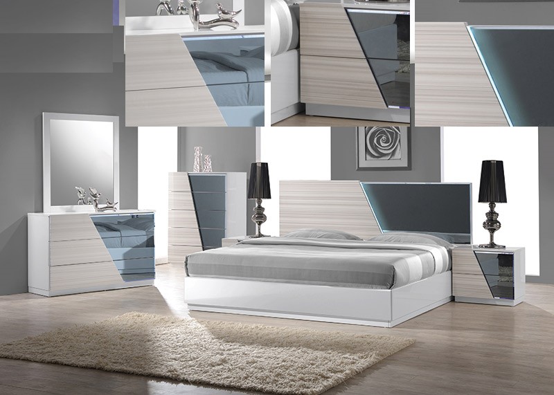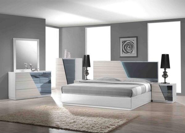 4 pc manchester zebra gray lacquer finish wood modern style queen bed set. Queen bed set includes the Queen bed frame with LED lighting, one nightstand, Dresser and mirror. Queen bed measures 72″ x 84″ x 44″ H. Nightstand measures 22″ x 18″ x 20″ H, Dresser measures 47″ x 19″ x 31″ H. Mirror measures 34″ x 1″ x 39″ H. Some assembly required for the bed frame set and mirror. Also available in Cal king and Eastern King at additional cost.