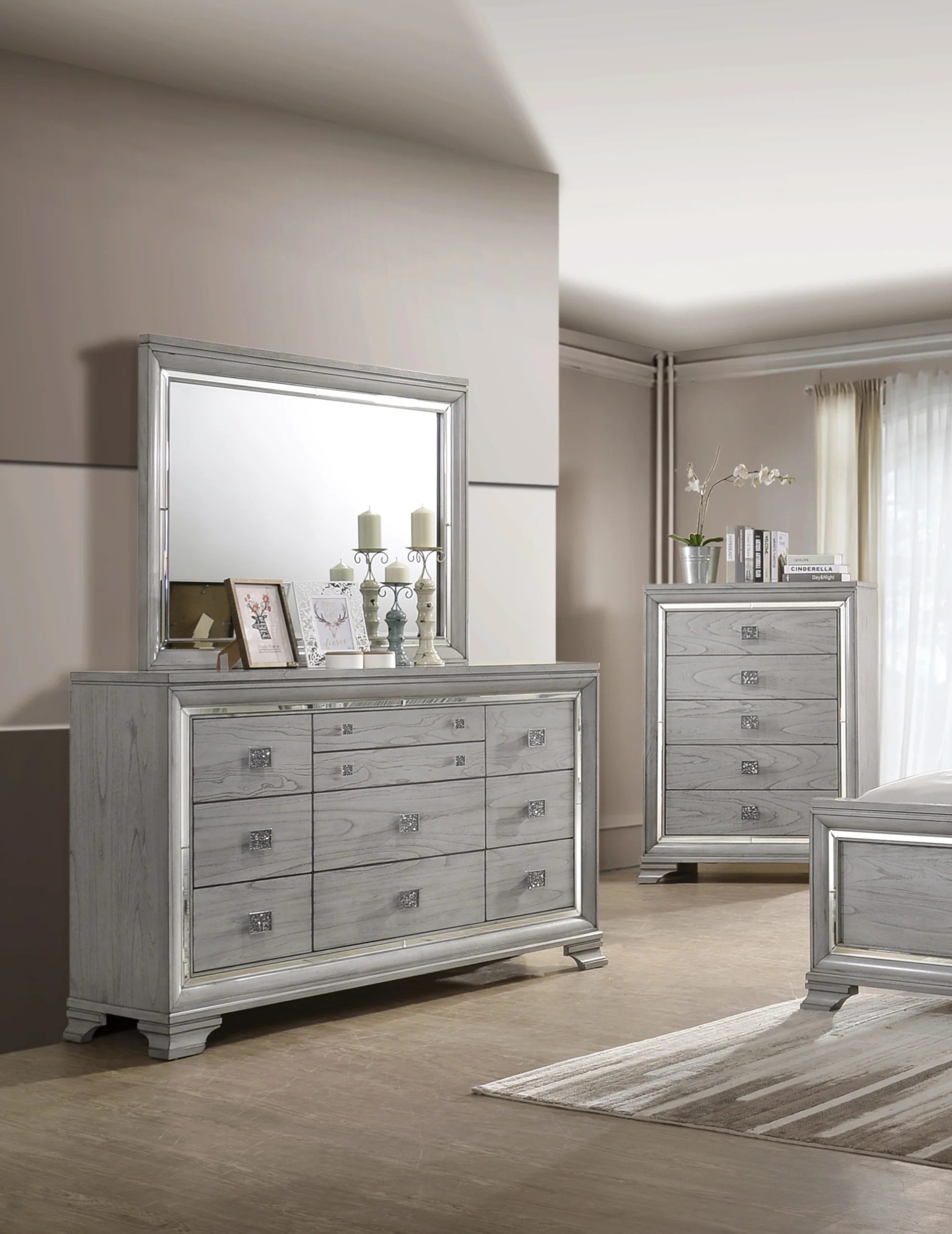 4 pc A & J homes studio vail metallic finish wood carved design queen bedroom set. This set includes the Bed, nightstand, dresser and mirror. Bed measures 64.5″ x 82.5″ x 70″ H Nightstand measures 30″ x 17.5″ x 29.4″ H. Dresser measures 66″ x 17.5″ x 41″ H. Mirror measures 49.2″ x 1.7″ x 38.8″ H. Chest available separately at additional cost and measures 38″ x 17.5″ x 53.7″ H. Also available in Eastern king at additional cost. Some assembly required