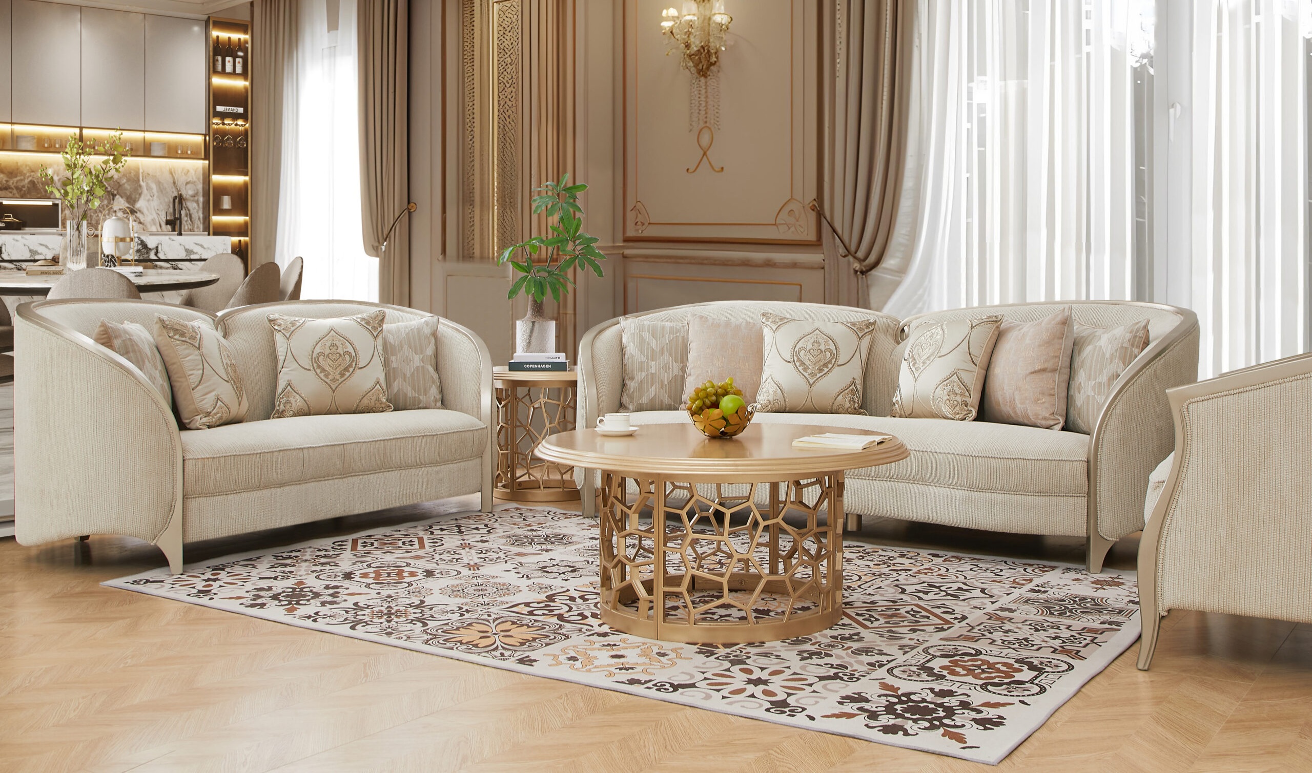 HD-7005-3PC Striking silver finish wood trim accents light colored chenille fabric upholstery Sofa , love and chair living room set. This set includes the Sofa, Love and Chair. Sofa measures 90″ x 38″ x 37.5″ H. Love seat measures 75″ x 38″ x 37.5″ H. Chair measures 35″ x 36.25″ x 37.5″ H. Some assembly may be required.