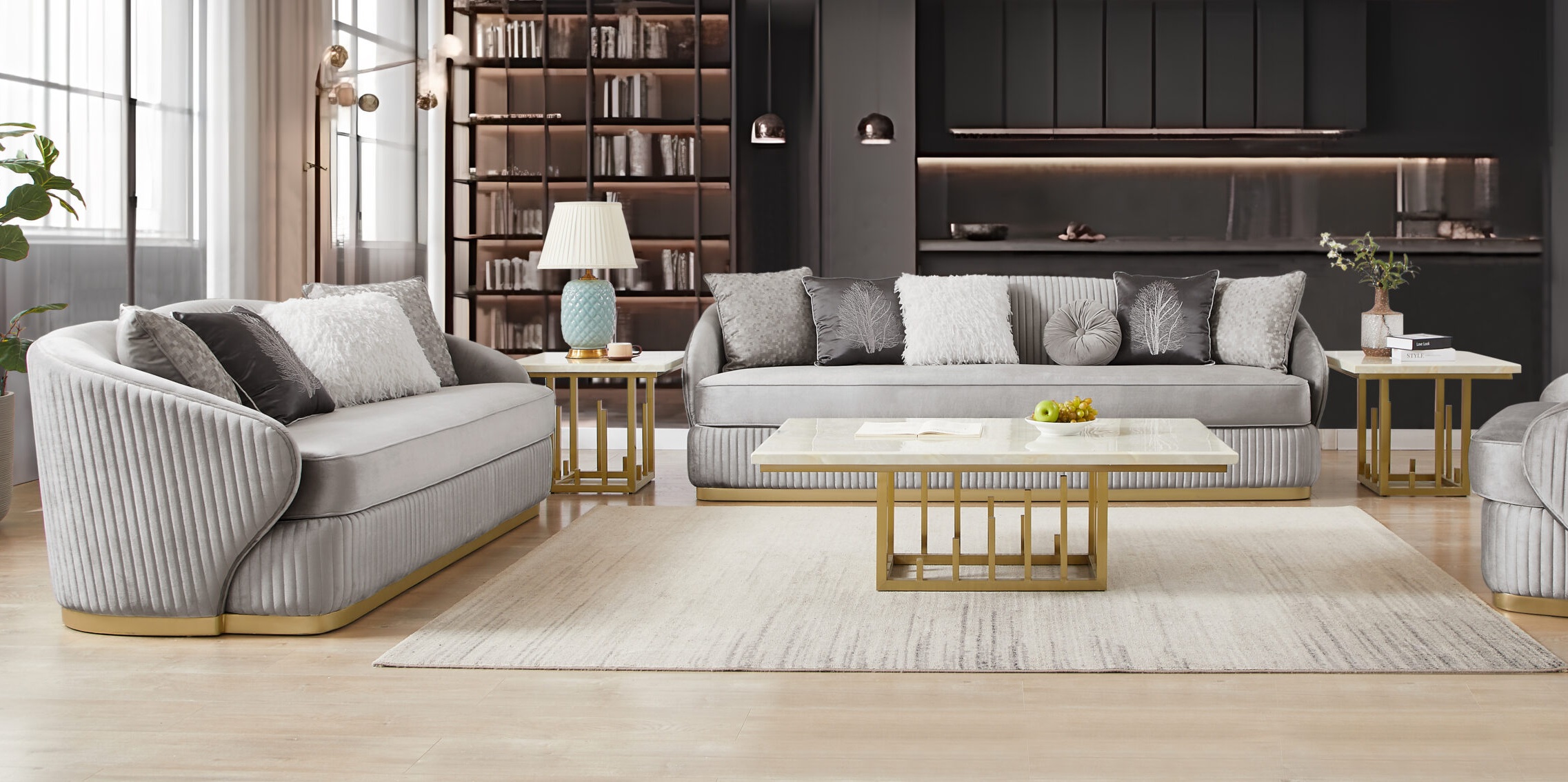 HD-7008-3PC Gold tone accents grey ribbed velvet fabric upholstery Sofa , love and chair living room set. This set includes the Sofa, Love and Chair. Sofa measures 91″ x 39.5″ x 36″ H. Love seat measures 75″ x 39.5″ x 36″ H. Chair measures 36.25″ x 39.4″ x 36″ H. Some assembly may be required.