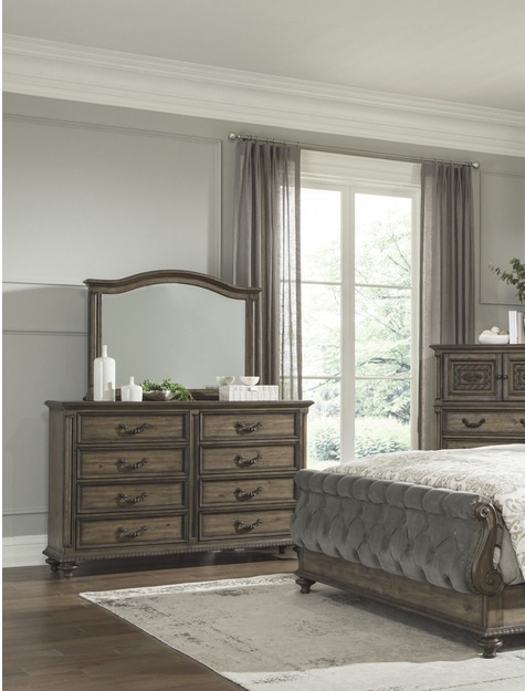 Homelegance 1693-4PC 4 pc Astoria grand rachelle weathered pecan finish wood queen bedroom set. This set includes the Bed, Nightstand, Dresser, Mirror . Bed measures 67.5″ x 103″ x 64″ H. Nightstand measures 28″ x 17.5″ x 29″ H. Dresser measures 64″ x 18″ x 42″ H. Mirror measures 46″ x 4.5″ x 34″ H. Chest available separately at additional cost and measures 44″ x 18″ x 58″ H. Also available in Cal king and Eastern King. Some assembly required.