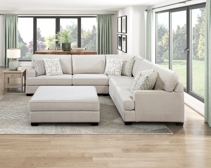 Homelegance 8435BE-42L2R 4 pc Beau beige chenille fabric upholstered 131″ x 131″ sectional sofa with large ottoman. This set includes the Left are right side one arm sofas with corner wedge and Large ottoman. Sectional measures 131″ x 131″ x 45″ D x 40″ H. Ottoman measures 51″ x 51″ x 20″ H. Some assembly required.