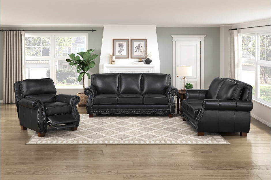 Homelegance 8448BLK-2PC 2 pc Remington black top grain leather match sofa and love seat set nail head trim accents. This set includes the Sofa and Love seat with nail head trim accents. Sofa measures 86″ x 40″ x 38″ H. Love seat measures 64.5″ x 40″ x 38″ H. Optional recliner chair also available separately at additional cost and measures 40.5″ x 41″ x 41.5″ H. Some assembly required.