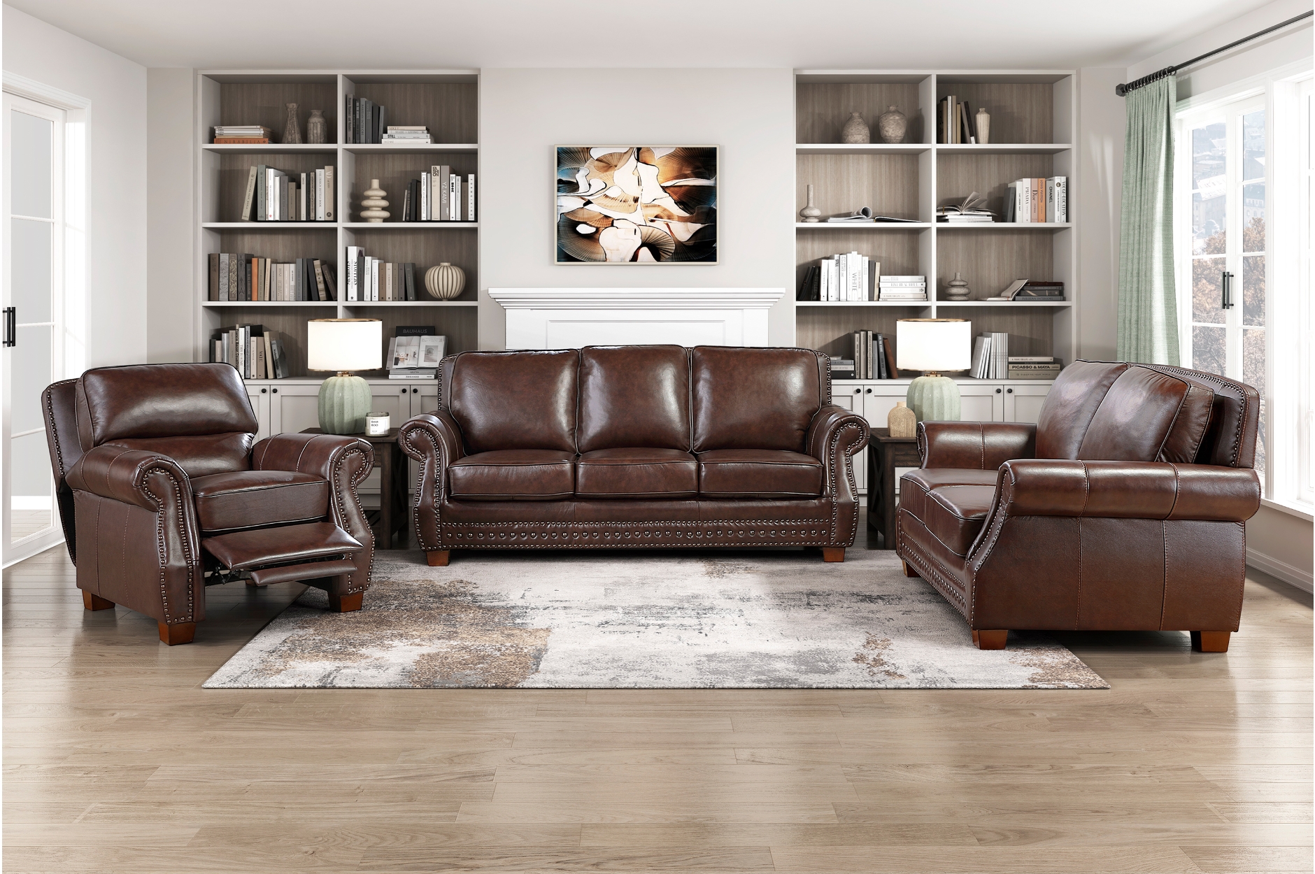 Homelegance 8448BRW-2PC 2 pc Remington brown top grain leather match sofa and love seat set nail head trim accents. This set includes the Sofa and Love seat with nail head trim accents. Sofa measures 86″ x 40″ x 38″ H. Love seat measures 64.5″ x 40″ x 38″ H. Optional recliner chair also available separately at additional cost and measures 40.5″ x 41″ x 41.5″ H. Some assembly required.